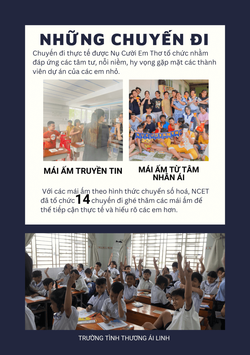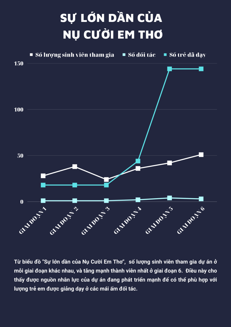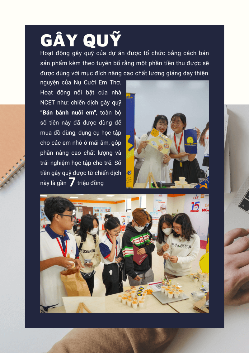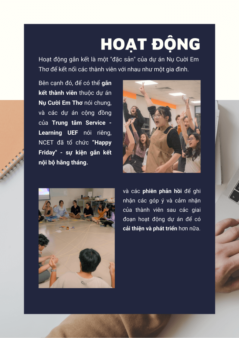 Những hoạt động được dự án tổ chức với các mục đích gây quỹ, gắn kết nội bộ,... đánh dấu sự cải thiện và trưởng thành không ngừng của mỗi thành viên dự án nói riêng và Nụ cười em thơ nói chung để có những bước đi vững vàng hơn trong tương lai.