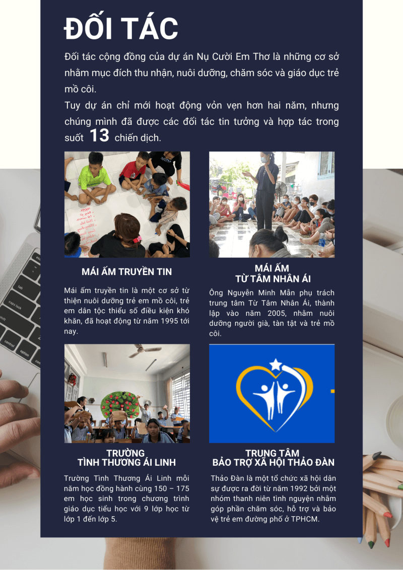 Nụ cười em thơ vinh dự được đồng hành cùng các đơn vị Mái ấm Truyền Tin, Mái ấm Từ Tâm Nhân Ái, Trường tình thương Ái Linh và Trung tâm Bảo trợ Xã hội Tao Đàn. Sự tin tưởng và tạo điều kiện hết mình từ quý đối tác cùng các em nhỏ là động lực giúp Nụ cười em thơ không ngừng vươn xa hơn trong tương lai.