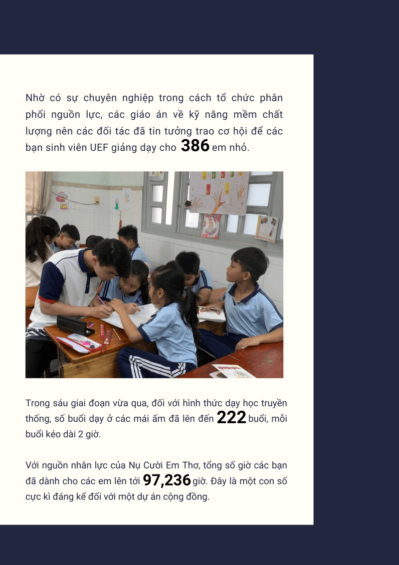 Tiếp bước hành trình “Trao đi yêu thương - Lưu giữ nụ cười” giai đoạn 6, dự án Nụ cười em thơ - thuộc Trung tâm Kết nối cộng đồng UEF, đã ghi dấu chặng đường ấn tượng bằng những khoảnh khắc đáng nhớ cùng những con số biết nói đáng tự hào.