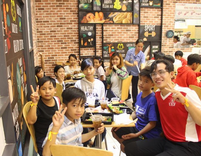 Sau các hoạt động với rất nhiều năng lượng, đoàn tham quan được Lotte Mart chiêu đãi với một bữa trưa tại khu vực ẩm thực của siêu thị. Nhiều trẻ đã chia sẻ: “Đây là lần đầu tiên con được đi, được ngồi ăn ở siêu thị”, những chia sẻ hồn nhiên này khiến các anh chị nhân viên Lotte lẫn các bạn sinh viên UEF rất cảm động.