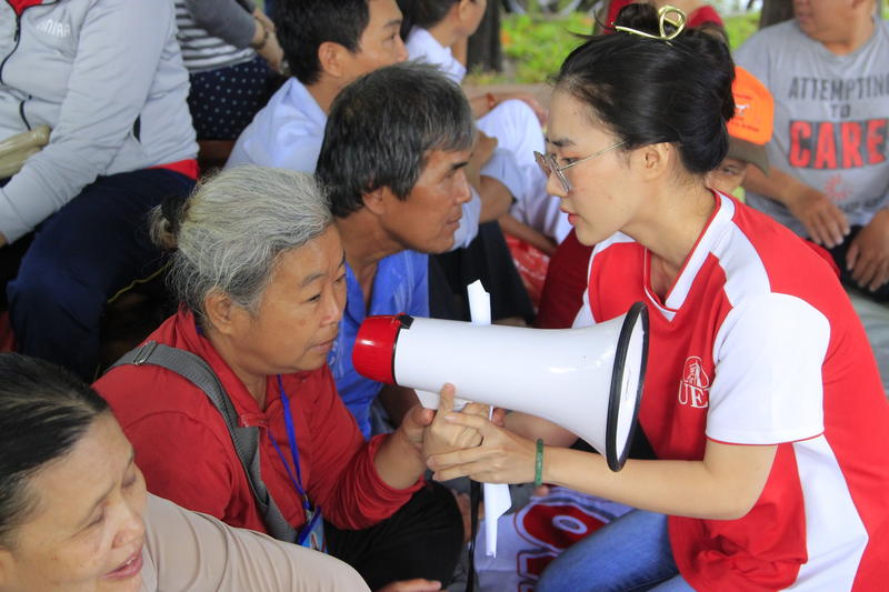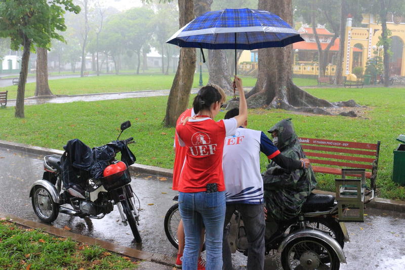 Bất chấp thời tiết xấu, các bạn sinh viên UEF vẫn chu đáo đón tiếp các anh chị khuyết tật
