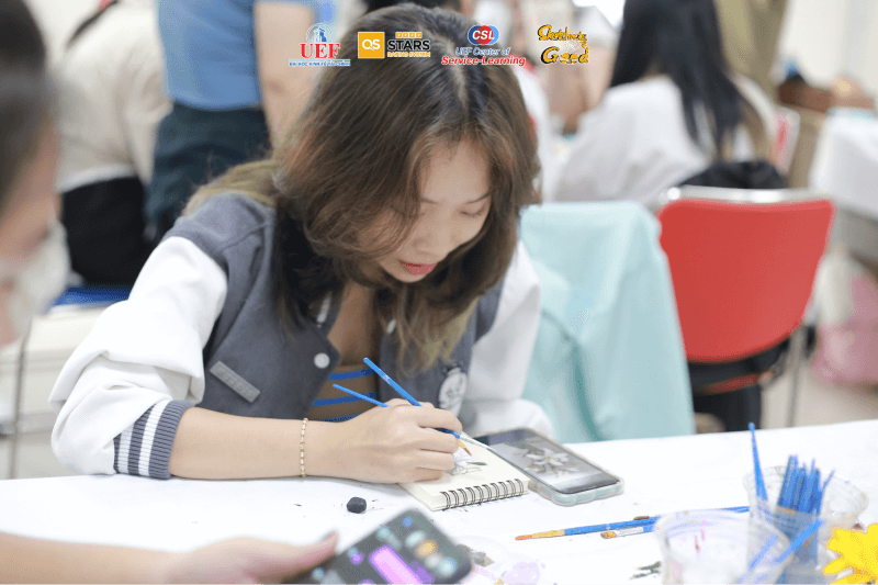 Trong buổi workshop, các bạn sinh viên được cung cấp các dụng cụ để vẽ và sổ tay nhỏ size A6. Sau đó, dưới sự hướng dẫn của các bạn thành viên dự án, mọi người cũng đã tự tay thiết kế bìa sổ mang vẻ đẹp và ý nghĩa riêng cho mình. “Đột nhập” vào không khí vui vẻ buổi hôm đó, chúng mình cũng đã phỏng vấn được một vài bạn sinh viên, mang về rất nhiều những giá trị tích cực: