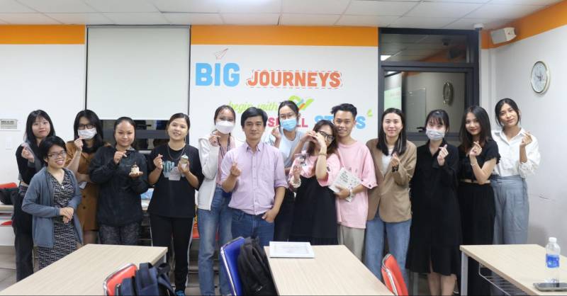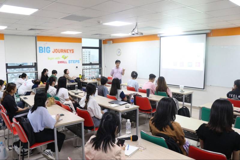 Không khí thoải mái kết hợp giữa học và chơi giữa Mentor Đào Phan - Founder & CEO của startup công nghệ Giáo dục iZi cùng các bạn sinh viên trong buổi tập huấn về “Kỹ năng trình bày dự án”