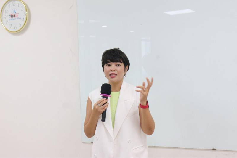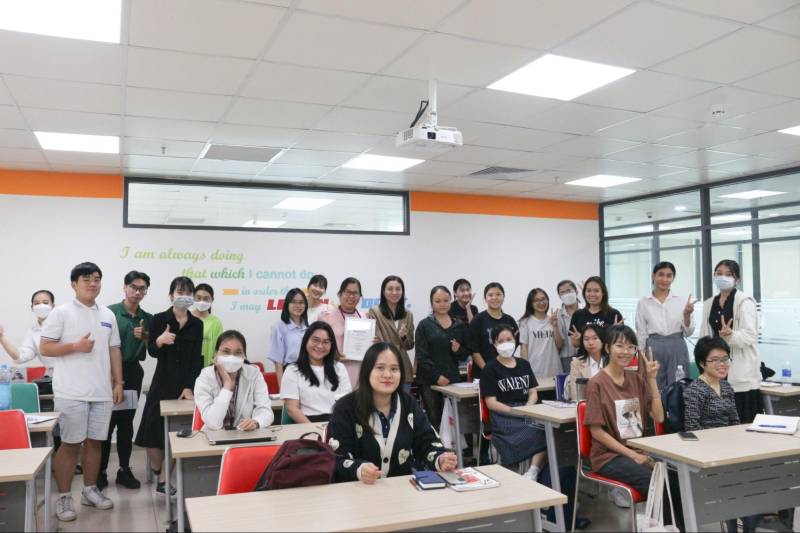 Cô Nguyễn Thu Hà - Giảng viên tại Học viện Cán bộ TP.HCM và thỉnh giảng cho các trường Đại học tại TP.HCM cùng các bạn sinh viên trong buổi tập huấn “Những lầm tưởng trong khởi nghiệp”