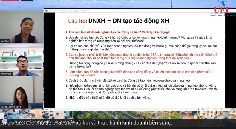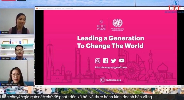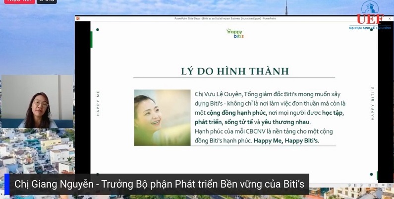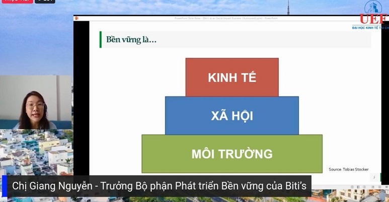 Vào sáng ngày 3/7 vừa qua, hơn 450 bạn sinh viên UEF đã cùng tham gia buổi Hội thảo trực tuyến với chủ đề Social Impact Business (SIB) - Xu hướng thế giới và thực hành tốt tại Biti's Việt Nam với các anh chị chuyên gia đến từ các doanh nghiệp và tổ chức uy tín: Chị Giang Nguyễn - Trưởng bộ phận Phát triển bền vững từ doanh nghiệp Biti’s và Anh Hiếu Đoàn - Giám đốc phát triển chương trình Hult Prize khu vực Đông Nam Á.