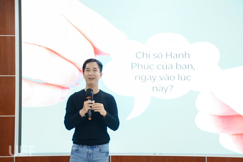 Sau khi các thầy cô tự đánh giá về chỉ số hạnh phúc của bản thân trong một ngày làm việc, diễn giả đã chia sẻ những trải nghiệm mà mình tích lũy được. Qua đó, anh cho biết, hạnh phúc có hai dạng: hạnh phúc tự thân và tạo dựng hạnh phúc.