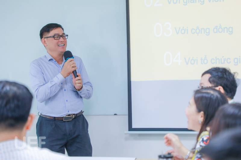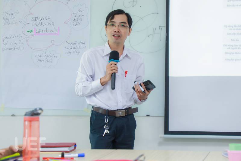 Đến dự buổi chia sẻ, TS. Nhan Cẩm Trí - Phó Hiệu trưởng Nhà trường cũng bày tỏ niềm vui khi hoạt động được nhiều thầy cô tham gia: “Tại UEF, chúng ta có Trung tâm Kết nối cộng đồng đang hoạt động bài bản. Lồng ghép hoạt động Service - Learning vào môn học là phương pháp giảng dạy hiệu quả, mang lại những giá trị lớn sau môn học. Mong rằng hôm nay chúng ta sẽ phân tích kỹ và bàn luận sâu hơn về phương pháp này, để có thể phát triển hơn trong tương lai.”