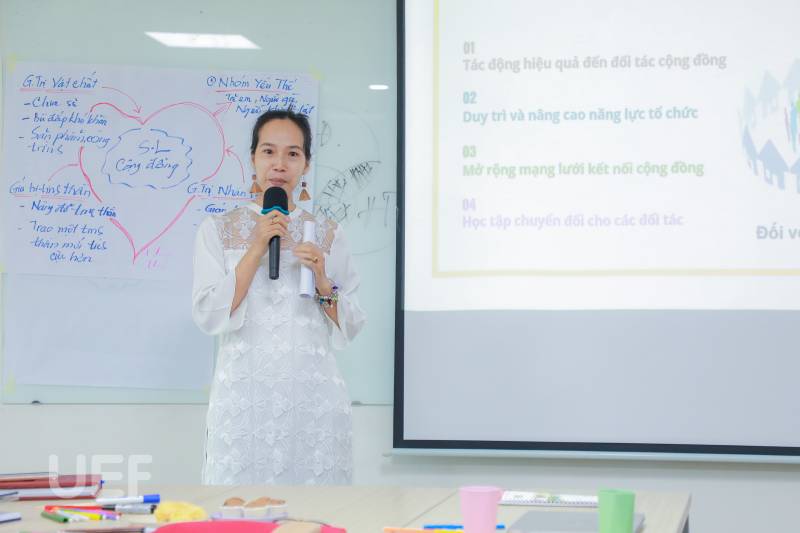 Tham gia buổi chia sẻ còn có chị Trương Thị Thu Trang - Đại diện IECD Việt Nam - Viện Hợp tác và Phát triển châu Âu. Chị cũng chia sẻ một trong những dự án của mình, là dự án hướng đến các đối tượng lao động nhỏ, xây dựng và hỗ trợ để xây dựng cho nền kinh tế ngày càng phát triển hơn. Đề cập đến việc kết nối với UEF, đại diện phía tổ chức cảm thấy may mắn khi có thể hợp tác với nhà trường để mang lại những giá trị lớn cho cộng đồng.