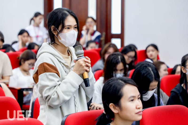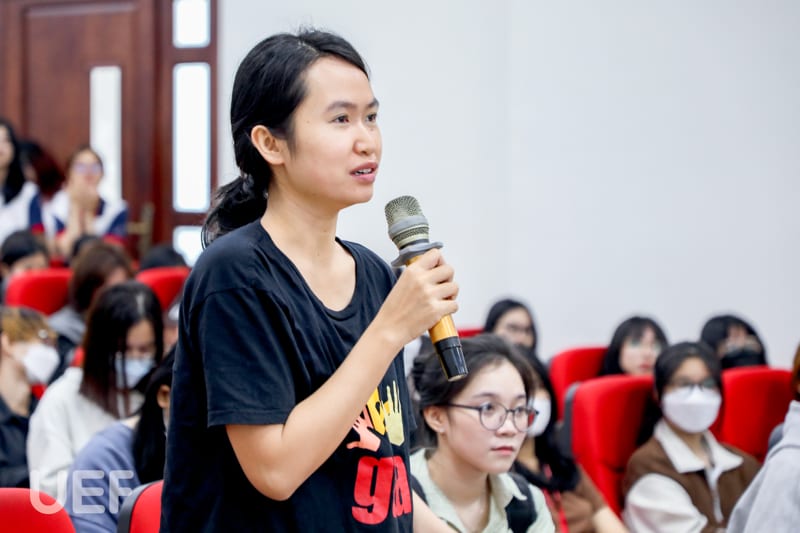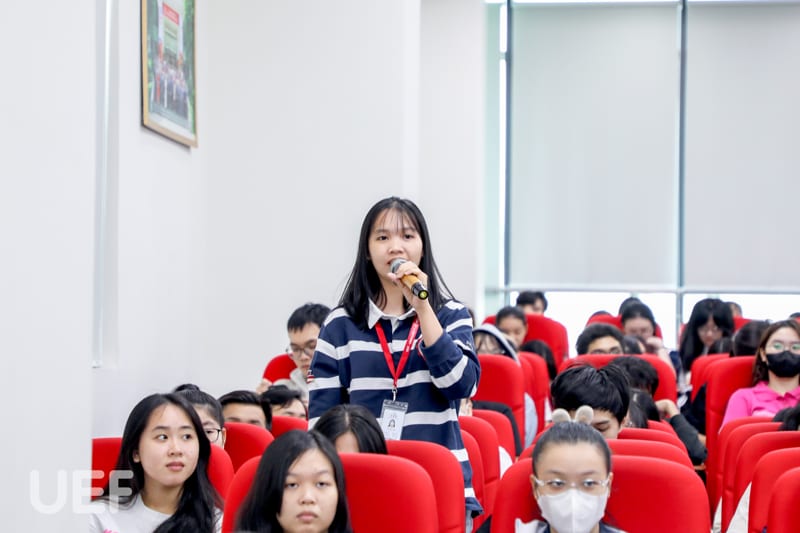 Sau khi lắng những chia sẻ của diễn giả, UEFers đã được truyền thêm cảm hứng về sống xanh từ thời trang thân thiện với thiên nhiên. Các bạn sinh viên đã nhanh chóng đặt câu hỏi về thương hiệu thời trang, quá trình phát triển cũng như mục tiêu và bí quyết giúp thương hiệu trở nên có ích cho cuộc sống. Diễn giả trực tiếp giải đáp rõ những câu hỏi rất ấn tượng và chuyên sâu của các bạn sinh viên.