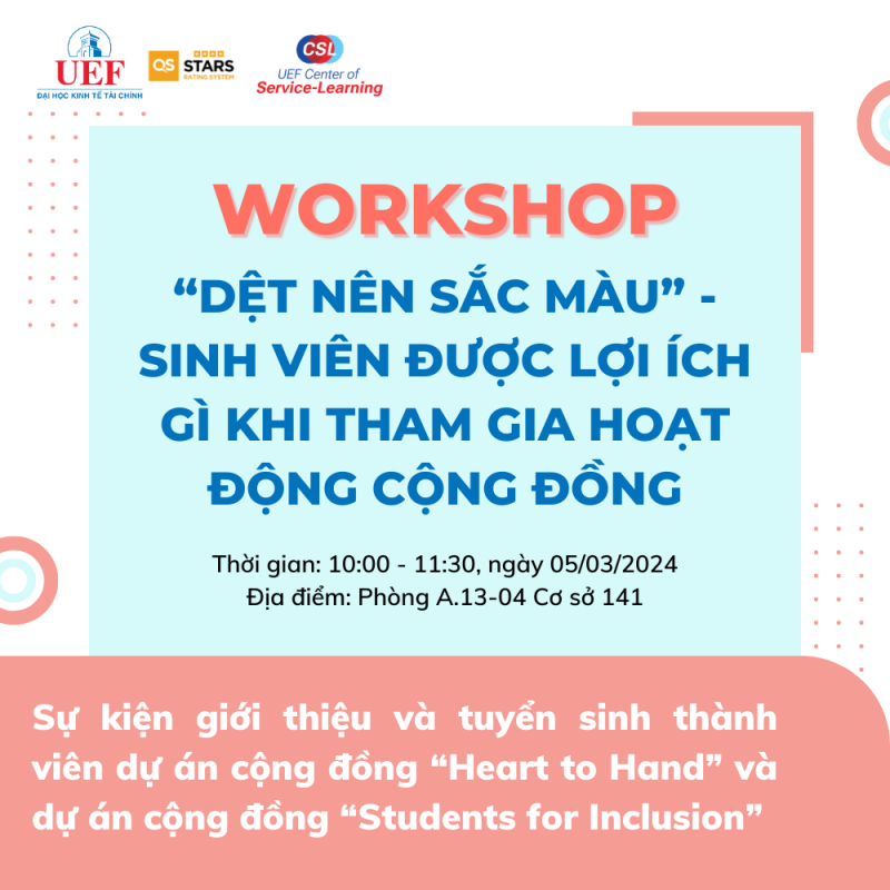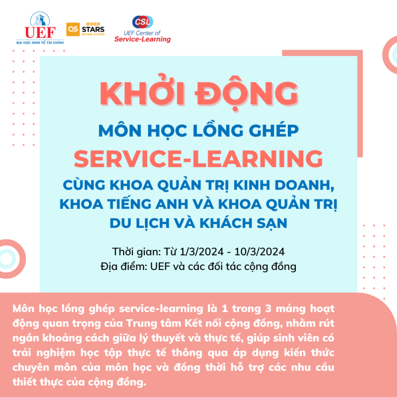Trung tâm Service-Learning hân hoan chào đón tháng 3 với những sự kiện sôi động và không kém phần thú vị. Hãy cùng CSL lấy lại năng lượng sau kỳ nghỉ Tết bằng những hoạt động hấp dẫn sẽ diễn ra trong tháng 3 này tại bản tin dưới đây!