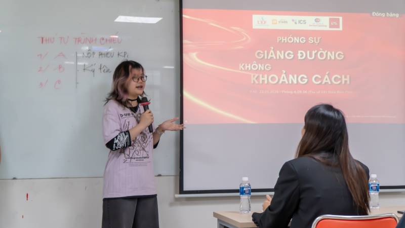Phóng sự “Giảng đường không khoảng cách” của nhóm 11 bạn sinh viên năm cuối đã trở thành điểm nhấn đáng chú ý khi lựa chọn lồng ghép yếu tố cộng đồng vào bài tập.. Nhóm đã chủ động đồng hành cùng mô hình Service - Learning, kết nối với Trung tâm ICS để tiếp cận những chất liệu đời sống thật và những nhân vật thật, từ đó tạo nên một sản phẩm mang hơi thở thực tế, gần gũi và giàu tính nhân văn.