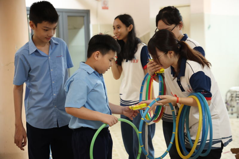 Với chủ đề “Tỏa sáng từ những khác biệt”, các em học sinh được tham gia vào các hoạt động vui chơi, giao lưu tại các trạm trò chơi như: bong bóng âm nhạc, ném vòng vào cột, vũ điệu ánh sáng, phòng tô màu tranh ảnh,... Các trò chơi vận động này được thiết kế và vận hành các bạn sinh viên Nhà UEF.