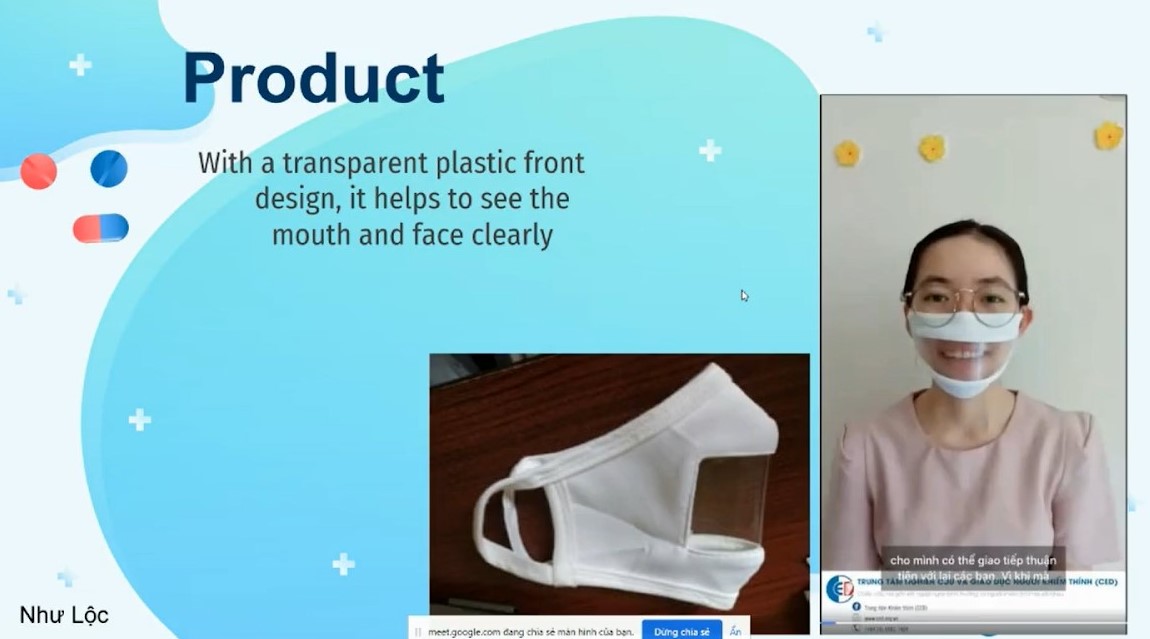 Với tổ chức CED, đề tài mà 4 nhóm sinh viên chọn tham gia là lập kế hoạch Direct Marketing cho sản phẩm khẩu trang trong suốt. Đây là sản phẩm mà CED mong muốn sẽ được hỗ trợ để nhiều người sử dụng nhằm tăng chất lượng giao tiếp của người khiếm thính, nhất là với những người có thể đọc được tín hiệu môi.
