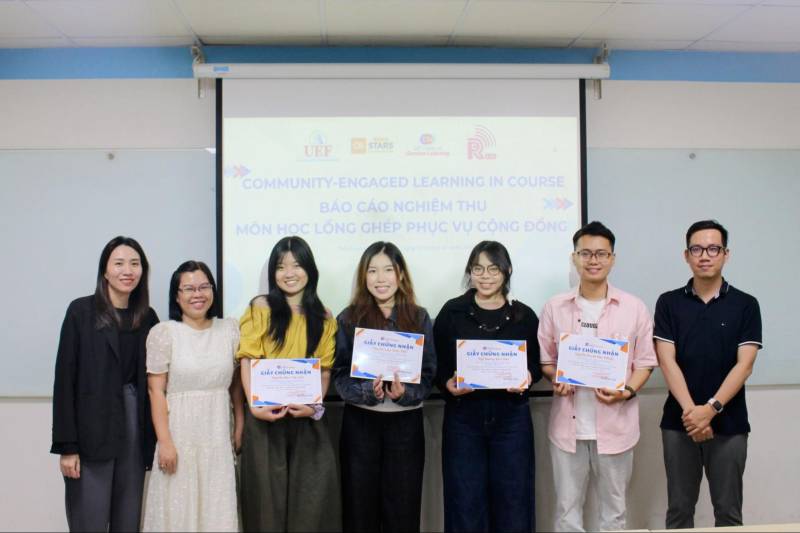 Kết thúc buổi báo cáo, Trung tâm Kết nối cộng đồng UEF đã trao giấy chứng nhận cho các sinh viên tham gia dự án, ghi nhận những nỗ lực và tâm huyết trong suốt quá trình thực hiện. Đây không chỉ là một bài học lý thuyết mà còn là cơ hội quý giá để các bạn áp dụng kiến thức vào thực tiễn, đồng thời tạo giá trị ý nghĩa cho cộng đồng.