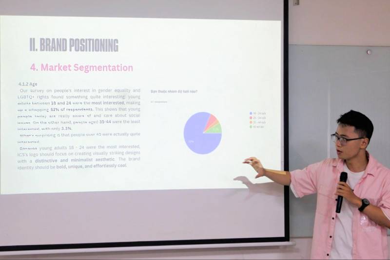 Đáng chú ý, nhóm sinh viên đề xuất một bộ nhận diện thương hiệu mới, trong đó logo được cách điệu chữ “pride” thành hình trái tim đa sắc màu, thể hiện tinh thần sống động và chạm đến cảm xúc của cộng đồng. Đi kèm là slogan mới “Tăng quyền của cộng đồng LGBTQ+ - Vì tự hào và quyền bình đẳng,” nhấn mạnh mạnh mẽ sứ mệnh của tổ chức. Bên cạnh đó, nhóm cũng giới thiệu các giải pháp cải tiến chiến lược truyền thông trên nền tảng Facebook, tập trung vào việc đồng nhất hình ảnh và thông điệp giữa các sub-brand của ICS và đề xuất thay đổi cách truyền tải thông điệp nhằm nâng cao hiệu quả tiếp cận đối tượng Gen Z.