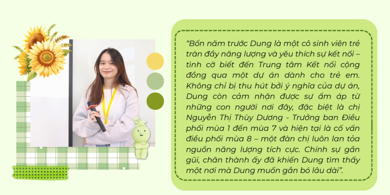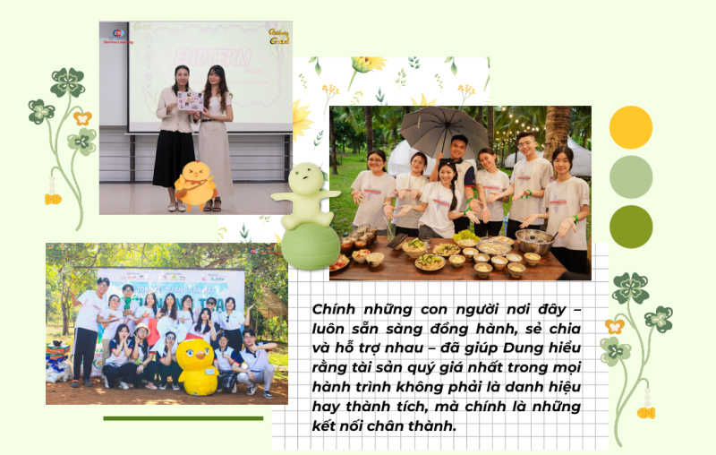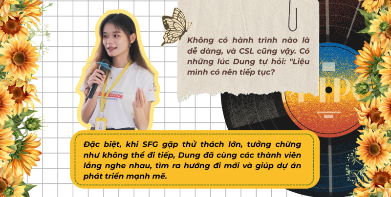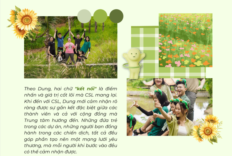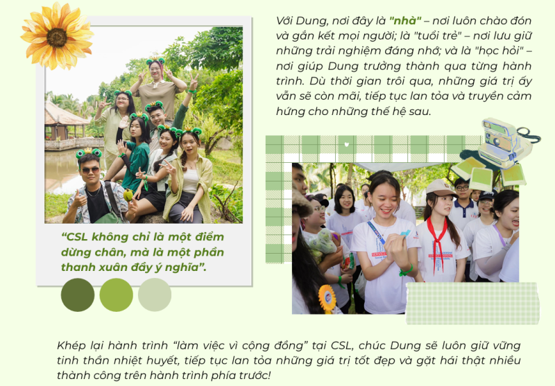 Điều gì đã khiến một sinh viên gắn bó với CSL suốt bốn năm? Với Dung, câu trả lời nằm ở ba yếu tố đó là con người, giá trị và hành trình học hỏi. CSL không chỉ đơn thuần là một trung tâm hướng tới cộng đồng, mà còn là một môi trường giúp Dung trưởng thành, rèn luyện kỹ năng và mở rộng tầm nhìn. Chính những con người nơi đây – luôn sẵn sàng đồng hành, sẻ chia và hỗ trợ nhau – đã giúp Dung hiểu rằng tài sản quý giá nhất trong mọi hành trình không phải là danh hiệu hay thành tích, mà chính là những kết nối chân thành.