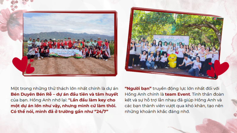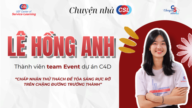 Hồng Anh của hai năm trước chưa có nhiều kinh nghiệm và trải nghiệm. Nhưng qua từng dự án và được mọi người tin tưởng giao vị trí Key chính như là Bén duyên bén rễ, Shine Bright, Siêu nông trại và còn nhiều dự án hay ho khác nữa, bạn đã tích góp sự tự tin và phát triển bản thân. Nhờ những người bạn đồng hành vô cùng chất lượng, Hồng Anh có thể dễ dàng hòa nhập và mở lòng mình kết nối với mọi người nhiều hơn. "Đừng sợ vẽ sai, miễn là bạn không để bức tranh mãi dang dở!" - Đó là một bài học quý giá mà Hồng Anh đã rút ra được khi tham gia CSL. Câu nói này đã giúp bạn vượt qua nỗi sợ hãi và tự tin hơn trong việc thực hiện các dự án mới.