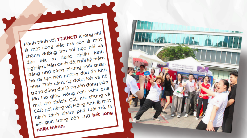 “Người nhà” – đó là hai từ Hồng Anh nghĩ đến mỗi khi nhắc về CSL. Với bạn, CSL nói chung và C4D nói riêng luôn là một tập thể thân thiện, nơi mọi người hỗ trợ nhau hết mình và cùng nhau phát triển theo hướng tốt đẹp hơn mỗi ngày. Hành trình đồng hành cùng những “người nhà” ấy đã giúp bạn tìm ra kim chỉ nam phát triển bản thân, đó là sự tự tin, năng động, sáng tạo và nhiệt huyết.