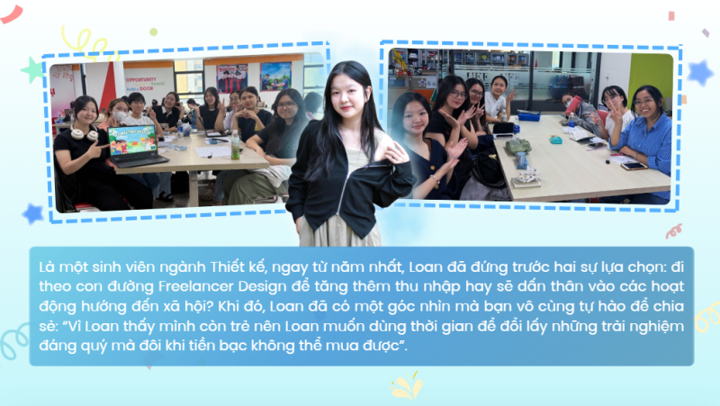 Đó là lời mở đầu đầy chân thành và tự hào của bạn Nguyễn Trúc Phương Loan (Aiyu Kim) - Trưởng ban Thiết kế dự án Communication for Development (C4D). Với Loan, 3 năm học Thiết kế đồ họa tại UEF cũng là 3 năm bạn miệt mài đưa những nét vẽ của mình ra khỏi màn hình máy tính để trở thành những "dấu chân" trải nghiệm đầy tự hào tại Center of Service-Learning (CSL) (Center of Service-Learning).