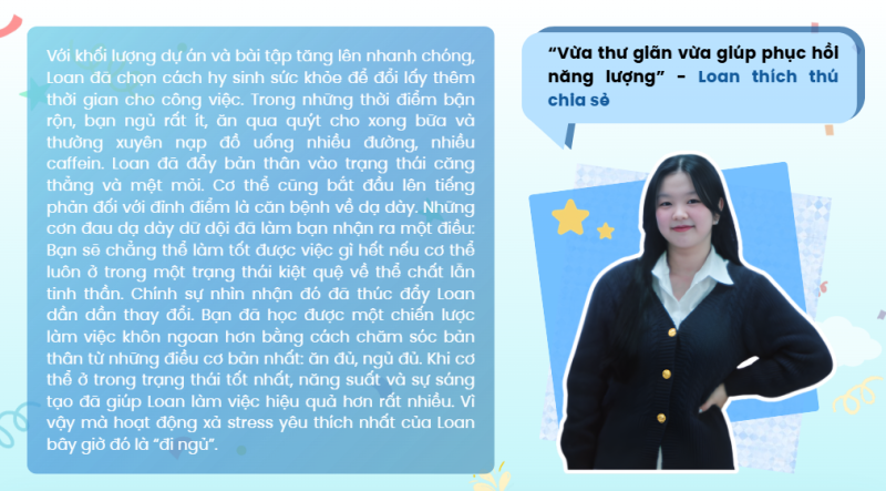 Sau 3 năm làm việc tại CSL, thức uống yêu thích bây giờ của Loan là một ly nước ép ổi, không đường, ít đá. Đây không chỉ là sự thay đổi sở thích cá nhân mà còn là một biểu tượng cho tinh thần yêu thương bản thân đúng cách mà Loan đang xây dựng. Khi tham gia CSL, Loan đã phải đón nhận thêm nhiều nhiệm vụ mới bên cạnh một mục tiêu quan trọng nhất mà bản thân đã đặt ra từ năm nhất: Cố gắng đạt được điểm A ở nhiều môn nhất có thể.