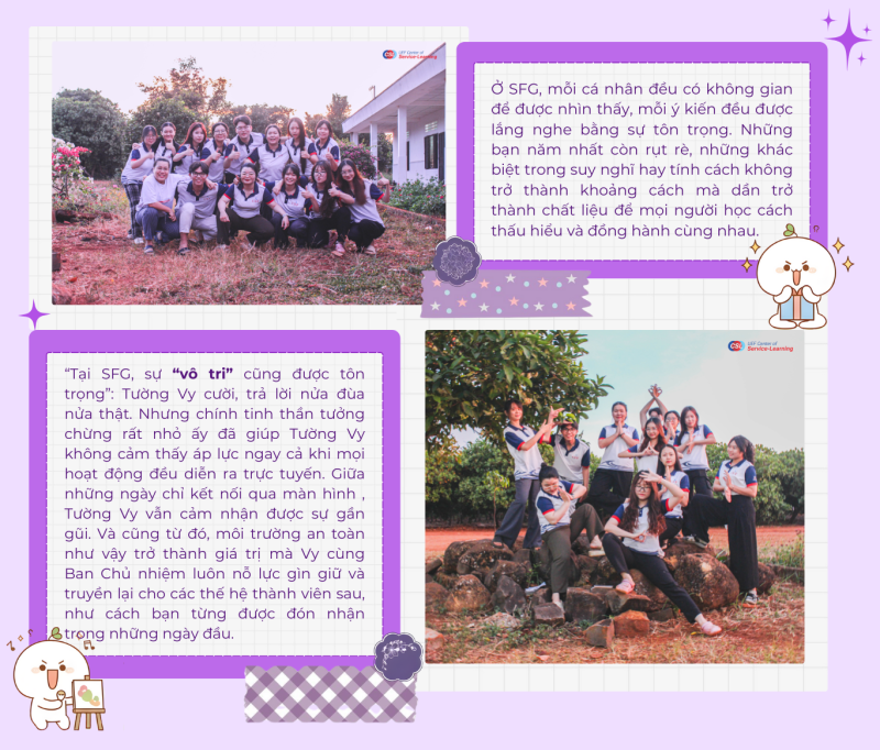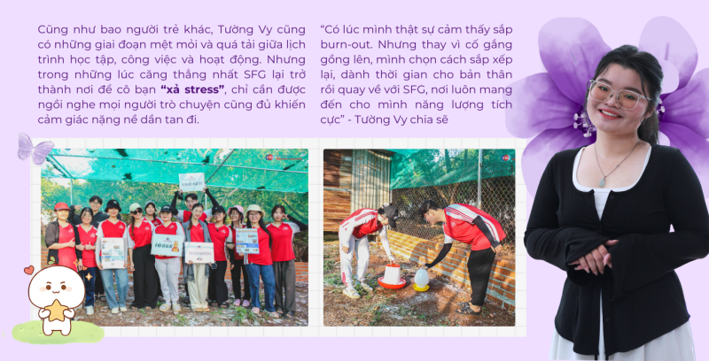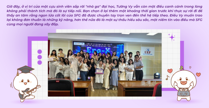 Gắn bó cùng SFG suốt bốn năm, Tường Vy chưa bao giờ xem đây là một điểm dừng. Với bạn, đó là một hành trình đồng hành, học hỏi và trưởng thành cùng nhau. Mỗi buổi họp, mỗi dự án được thực hiện chung đều là dịp để Tường Vy nhìn thấy sự tiếp nối ở thế hệ sau và cũng là lúc bạn tin rằng ngọn lửa mình từng được trao đang tiếp tục được giữ gìn và lan tỏa đúng cách.