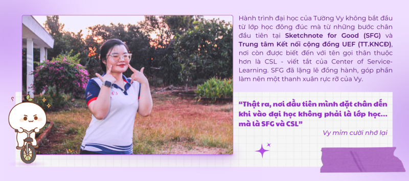 Thanh xuân của mỗi người thường gắn với một nơi đặc biệt để rồi mỗi lần nhớ lại, lòng lại thấy bồi hồi. Với Trương Ngọc Tường Vy, cựu sinh viên ngành Logistics Trường Đại học Kinh tế - Tài chính TP. Hồ Chí Minh (UEF), nơi ấy không phải là giảng đường quen thuộc mà chính là Sketchnote for Good (SFG). Một câu lạc bộ cộng đồng với mục tiêu hình ảnh hóa tài liệu học tập cho trẻ chậm trí. Ở nơi này, niềm vui của Tường Vy không chỉ dừng lại trong các hoạt động cộng đồng. Bạn từng bước lớn lên, học hỏi từ những câu chuyện giản dị và trở thành “người giữ lửa” đầy tận tụy.