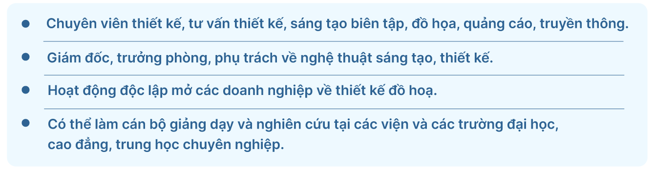 Chuyên viên thiết kế, tư vấn thiết kế, sáng tạo biên tập, đồ họa, quảng cáo, truyền thông.