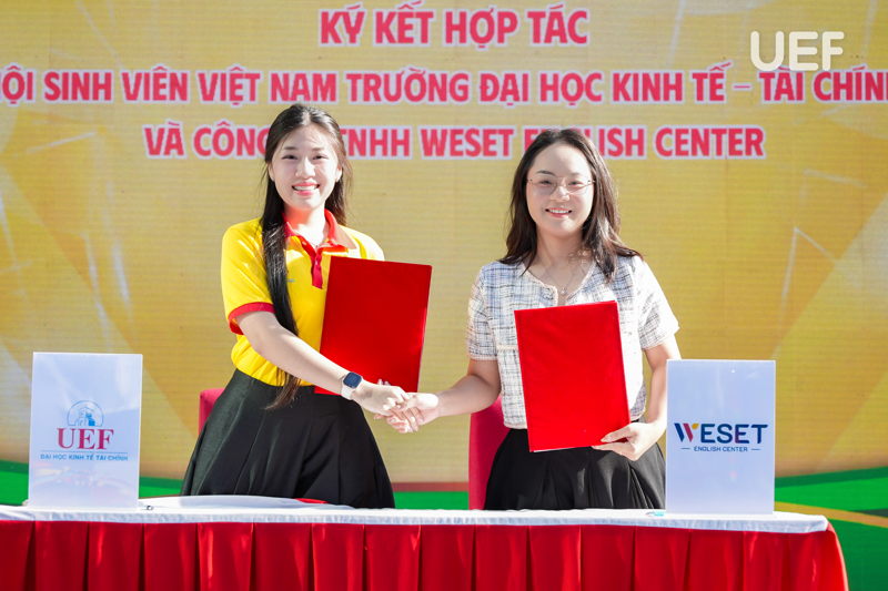 Trong khuôn khổ chương trình, Hội Sinh viên UEF thực hiện nghi thức ký kết hợp tác với Công ty TNHH WESET English Center, đánh dấu sự đồng hành của doanh nghiệp trong việc hỗ trợ các hoạt động phong trào sinh viên, đặc biệt là Chiến dịch Xuân tình nguyện 2026.