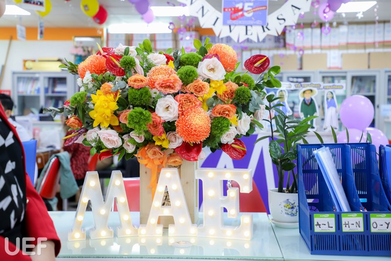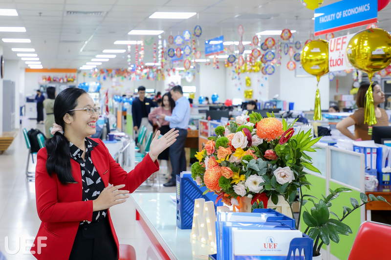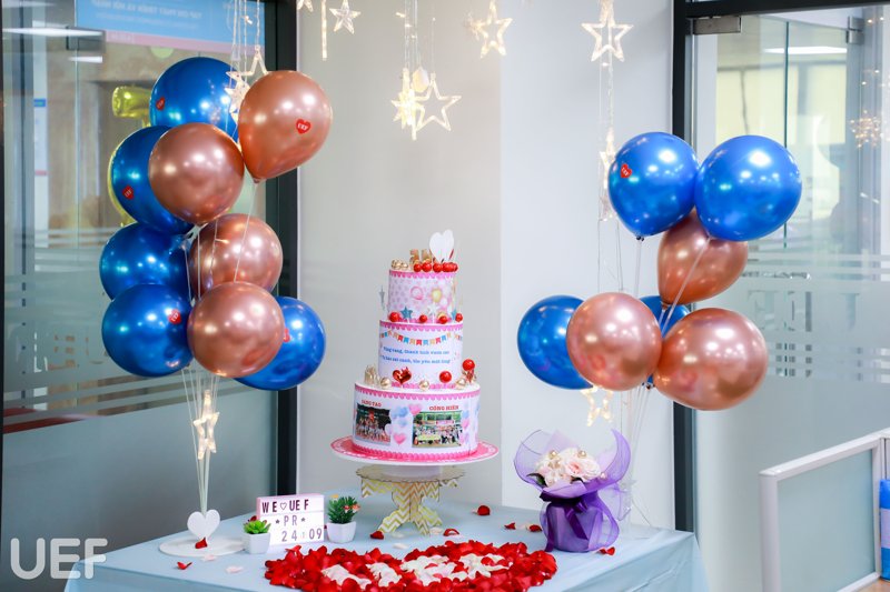 Những ngày này, mỗi khi có dịp ghé qua các phòng ban Nhà UEF, quý thầy cô và các bạn sinh viên sẽ được chiêm ngưỡng không gian làm việc đa sắc màu, nổi bật với những ý tưởng trang trí tạo dấu ấn, khác hẳn thường ngày. Bằng những vật dụng đơn giản như bong bóng, dây đèn trang trí, hoa, băng rôn chúc mừng,… các phòng ban đã bày tỏ tình yêu dành cho ngôi nhà chung UEF theo cách rất riêng. Dưới đây là một vài góc nhỏ được các đơn vị tâm huyết chuẩn bị cho cuộc thi “Trang trí văn phòng làm việc”: