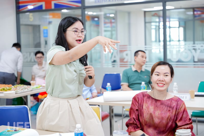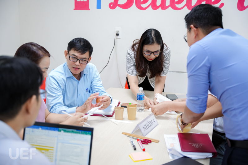 Buổi tập huấn khởi động sôi nổi với Egg game. Lần lượt các nhóm sử dụng những công cụ có sẵn như ống hút, băng keo, đũa tre để bảo vệ quả trứng trước các tác động vật lý mạnh. Hoàn thành trò chơi này, các thầy cô rút ra nhiều bài học giá trị trong công tác lãnh đạo, triển khai hoạt động trong đơn vị. Bằng tất cả những gì chúng ta có, hãy tận dụng hết năng lực của từng cá nhân ở đơn vị để đạt được mục tiêu đã đề ra, trong đó cũng cần phải ghi nhận và tôn trọng sự khác biệt, thầy Ngô Minh Hải nhấn mạnh. Điều này cũng tương tự như cách mà các nhóm tìm ra phương pháp để bảo vệ quả trứng từ những vật dụng có sẵn.