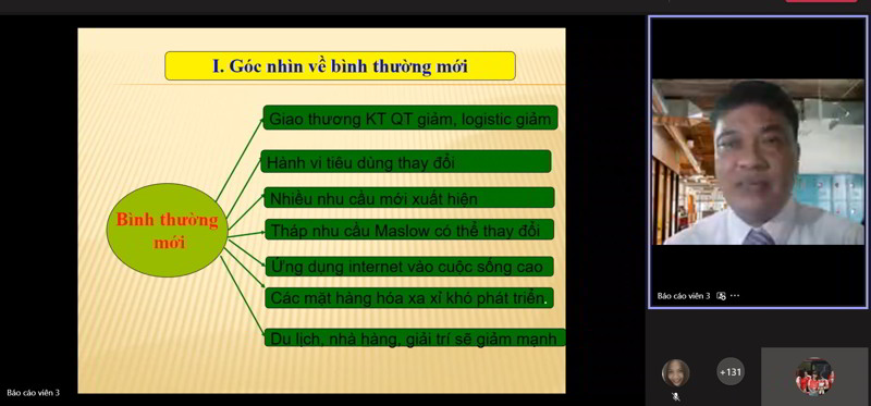Mở đầu phần chia sẻ, ông Lê Vinh Hoài Tịnh giúp sinh viên có thêm góc nhìn về thời bình thường mới với những thay đổi cơ bản từ hoạt động giao thương, hành vi tiêu dùng đến nhu cầu của khách hàng, các ứng dụng công nghệ,…