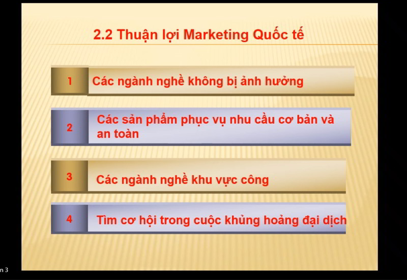 Tất nhiên, trong nguy vẫn có cơ, lĩnh vực này vẫn có những thuận lợi nhất định. Đặc biệt là những ngành nghề không bị ảnh hưởng nhiều như y tế, giáo dục, chứng khoán,…; Các sản phẩm phục vụ nhu cầu cơ bản và an toàn, thuộc khu vực công, các cơ sở kinh doanh dịch chuyển mặt hàng để tìm cơ hội trong khủng hoảng dịch bệnh. Ngoài sự dịch chuyển ngành nghề, trong bối cảnh bình thường mới, xu hướng phát triển Marketing quốc tế được thể hiện rõ nét qua việc ứng dụng công nghệ, internet, sự thay đổi trong cách tiếp cận thị trường.