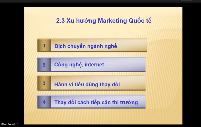 Từ góc nhìn chung này, sinh viên có cơ sở để hiểu rõ hơn về những khó khăn, thuận lợi và xu hướng phát triển của lĩnh vực Marketing quốc tế với sự tác động đa chiều từ kinh tế, văn hóa - xã hội, công nghệ, chính trị pháp luật.