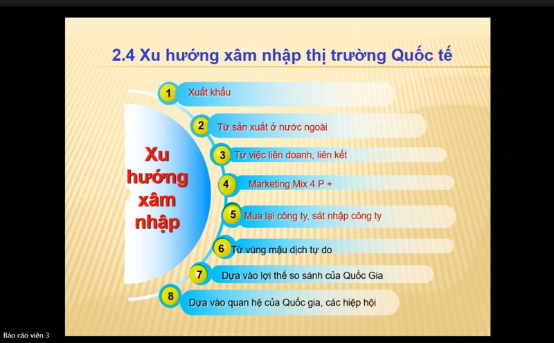 Cạnh đó, báo cáo viên còn phân tích cặn kẽ xu hướng xâm nhập thị trường quốc tế với 8 điểm cần lưu ý.