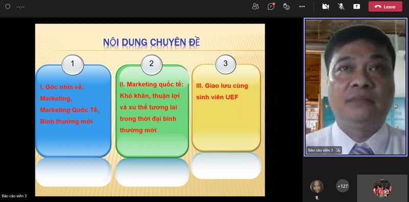 Khép lại tuần báo cáo chuyên đề gắn với môn học của khoa Quản trị kinh doanh, tối 17/12, sinh viên UEF đã được lắng nghe những chia sẻ về những thuận lợi, khó khăn, xu hướng phát triển của Marketing quốc tế trong bối cảnh bình thường mới từ ông Lê Vinh Hoài Tịnh, CEO Công ty TNHH World Vision (VN), Chủ tịch Hội đồng quản trị Red Elephant Co, Ltd.