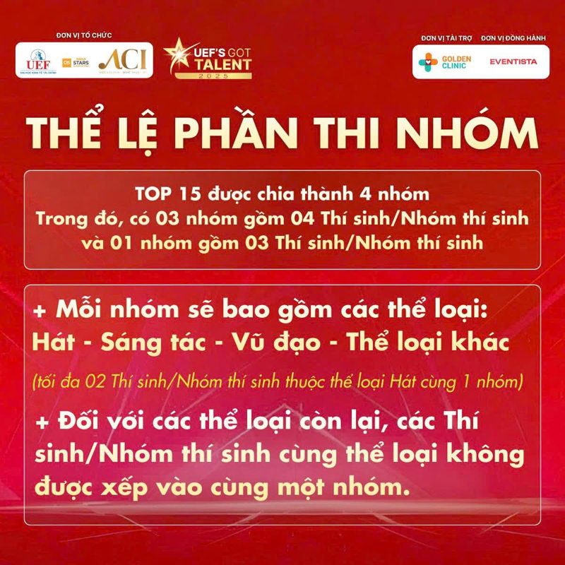 Sau hành trình thi so tài đầy nỗ lực và cảm xúc, UEF's Got Talent 2025 sẽ bước vào đêm Chung kết đầy hoành tráng vào ngày 19/12 tới đây tại sân trường UEF. Đêm thi hứa hẹn mang đến một bữa tiệc nghệ thuật đỉnh cao, nơi top 15 thí sinh/nhóm xuất sắc nhất sẽ tranh tài quyết liệt để tìm ra ngôi vị Quán quân.
