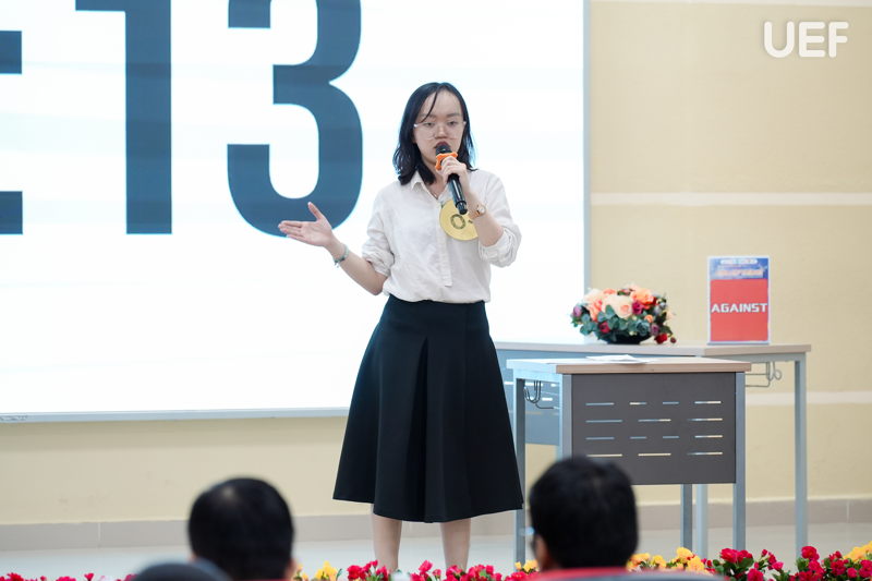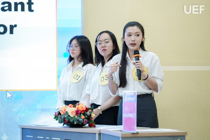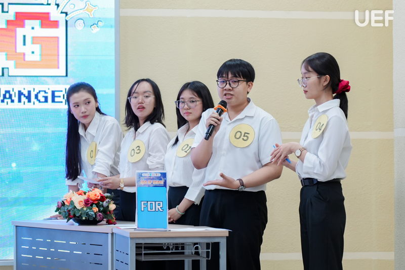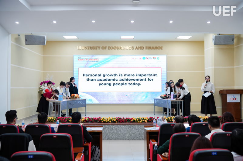 Ở phần thi nhóm, các đội tranh biện theo hình thức FOR - AGAINST với những chủ đề gần gũi với người trẻ như tác động của AI đến sự phát triển cá nhân hay mối quan hệ giữa thành tích học tập và phát triển bản thân. Việc phân vai rõ ràng, lập luận mạch lạc và dẫn chứng thuyết phục đã tạo nên những màn tranh biện sôi nổi, giàu tính học thuật.
