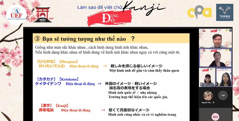 Phần chính của chương trình, các chuyên gia đã chia sẻ phương pháp học và viết chữ Kanji đến các bạn sinh viên thông qua tư duy sáng tạo, hình ảnh và tưởng tượng. Theo các chuyên gia, từ vựng tiếng Nhật rất nhiều, mỗi từ là mỗi ý nghĩa, vì thế, nếu chúng ta học được càng nhiều từ thì sẽ khám phá ra càng nhiều điều thú vị.