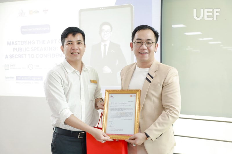 Hiểu được những khó khăn đó, sáng ngày 4/12, Khoa Tiếng Anh UEF đã tổ chức chương trình English Workshop 5 với chủ đề: “Mastering the art of public speaking – A secret to confidence". Đây là cơ hội để sinh viên học hỏi các kỹ thuật thuyết trình từ chuyên gia và thấu hiểu rằng, thuyết trình bằng tiếng Anh là cả một hành trình luyện tập và hoàn thiện bản thân. Chương trình có sự đồng hành của diễn giả Andy Trí Nguyễn, hiện là PhD Candidate in TESOL tại Trường Đại học Mở TP.HCM.