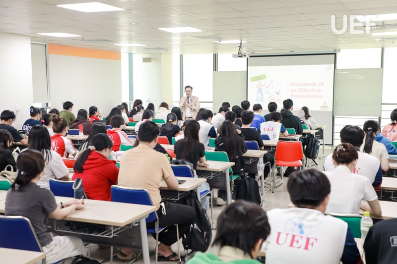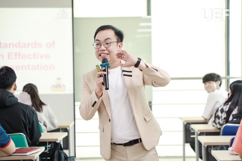 Bằng phương pháp truyền đạt sinh động, tính cách hài hước, diễn giả đã giúp UEFers vượt qua nỗi sợ thuyết trình bằng tiếng Anh với những bí quyết hữu ích