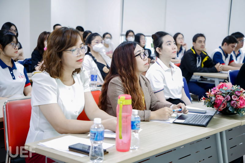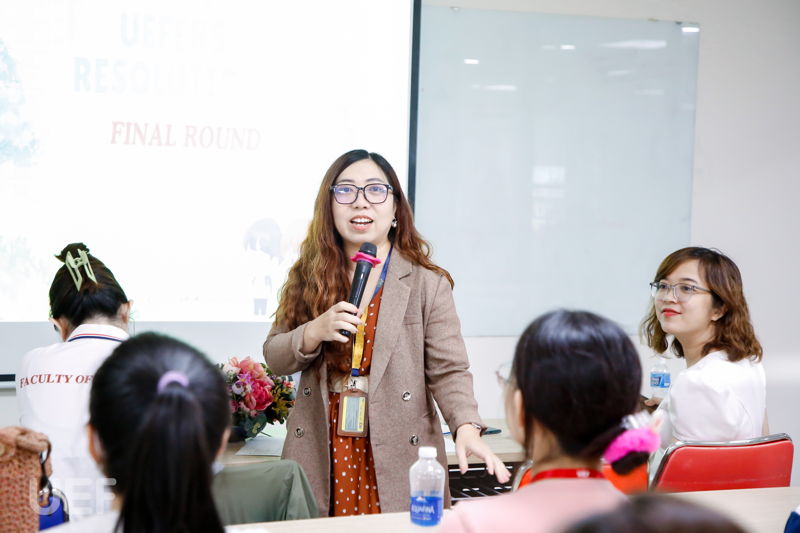 Tham dự vòng Chung kết cuộc thi UEFers' Resolutions có ThS. Nguyễn Đình Tuấn - Phó Trưởng Khoa Tiếng Anh, top 6 thí sinh xuất sắc và các bạn sinh viên Nhà UEF đến cổ vũ, tiếp thêm năng lượng cho chặng đua về đích. Cùng với đó là dàn giám khảo chuyên môn gồm có: ThS. Hoàng Thị Ngọc Hiền - Trợ lý Trưởng Khoa Tiếng Anh, ThS. Lê Thị Thảo Sương và ThS. Lê Hoàng Nhi An - Giảng viên Khoa Tiếng Anh.