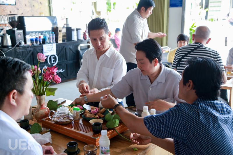 Tại cơ sở của Hội ngành hàng Sen Đồng Tháp, cả đoàn đã được hưởng thức ấm trà sen thơm lừng và cùng nhâm nhi hạt sen, dùng chả cuốn hoa sen. Vị rất lạ, nhưng rất ngon, các đầu bếp chia sẻ. Đến đây, các vị khách quốc tế cũng được giới thiệu về vùng trồng sen và quá trình đưa hình ảnh của sen trở thành một biểu tượng của Đồng Tháp.
