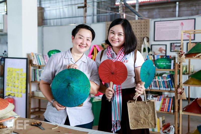Những bộ phận khác của sen như thân, lá cũng được xử lý để trở thành những vật hữu dụng. Để thấy rõ được điều này, mọi người đã bắt tay vào làm những món đồ trang trí từ lá sen và trải nghiệm kéo tơ từ thân sen. Lá sen qua xử lý và nhuộm màu trở nên mắt mắt, có thể dùng để làm quạt, trang trí bìa sổ tay, túi xách, nón lá,... Cả đoàn hào hứng trải nghiệm, sáng tạo những nét nghệ thuật mang đậm nét riêng trên từng sản phẩm. Mọi sản phẩm khách thực hiện đều được mang về làm quà lưu niệm.