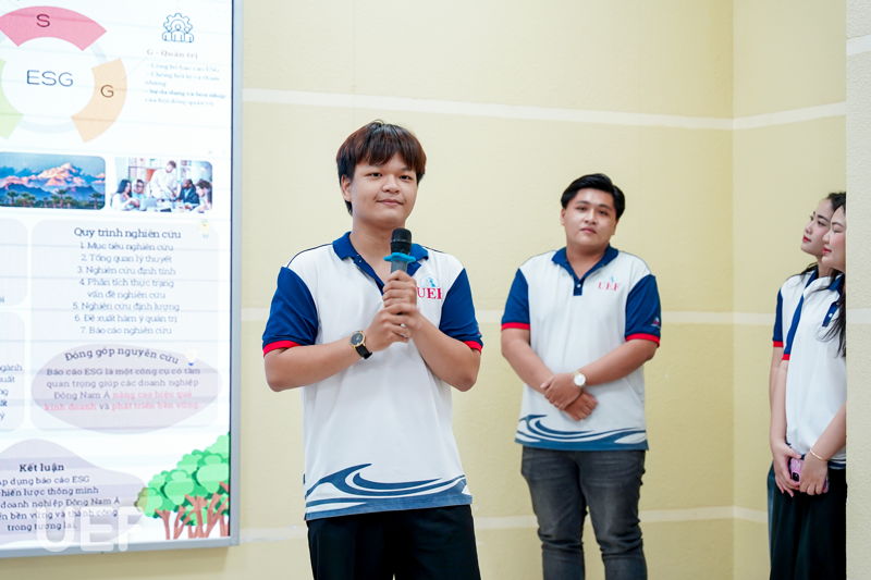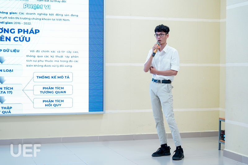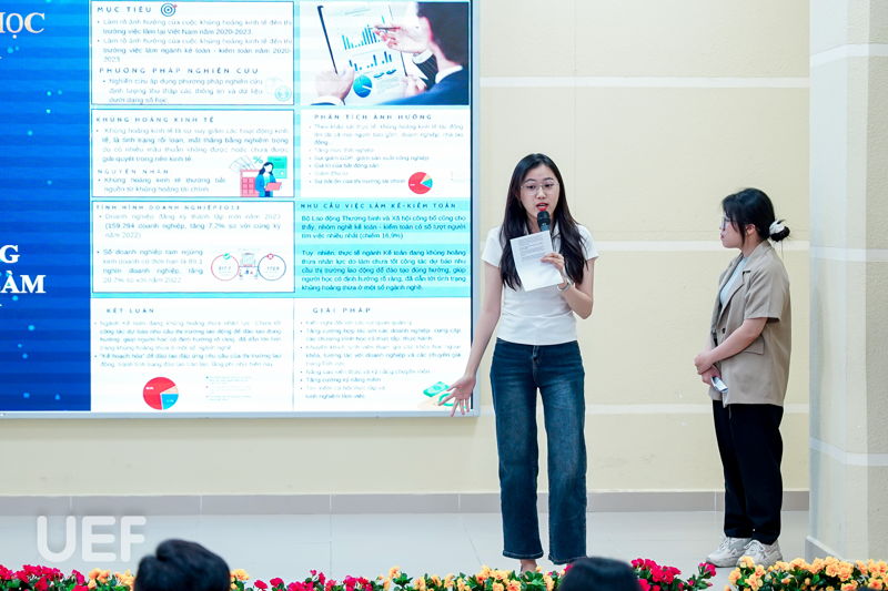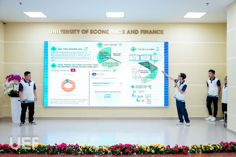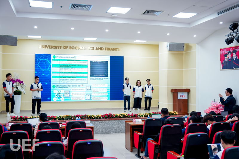 Mỗi nhóm tác giả có 10 phút để trình bày công trình khoa học của mình. Qua quá trình học tập, tìm hiểu, UEFers phát hiện nhiều vấn đề còn tồn tại trong lĩnh vực tài chính - kế toán và cần tìm ra phương hướng giải quyết phù hợp. Từ đó, các bạn cùng nhau bắt tay vào thực hiện nghiên cứu, khảo sát, phân tích dữ liệu, đánh giá và đưa ra giải pháp cho vấn đề. 11 công trình nghiên cứu khoa học tham gia vòng Chung khảo xoay quanh một số chủ đề như: mô hình thanh toán, thuế carbon, đầu tư xanh, thị trường chứng khoán, ESG, chuyển đổi số, ảnh hưởng của khủng hoảng kinh tế, hiệu quả tài chính của doanh nghiệp bất động sản,...