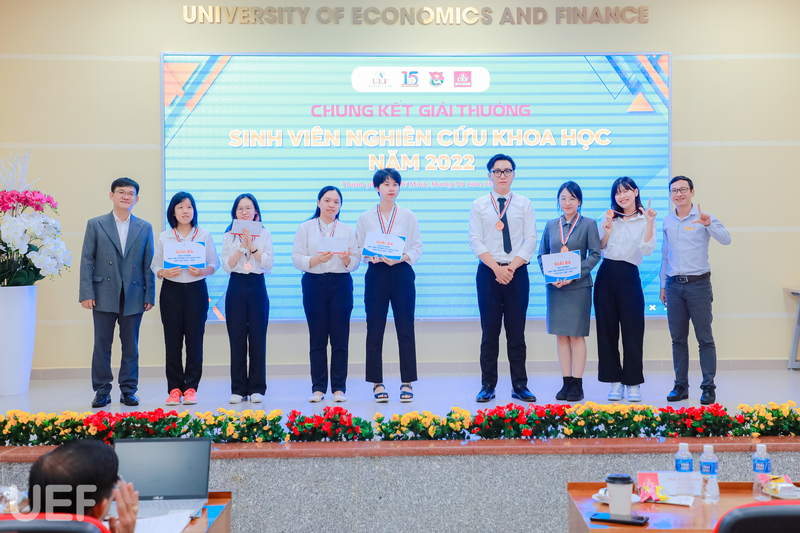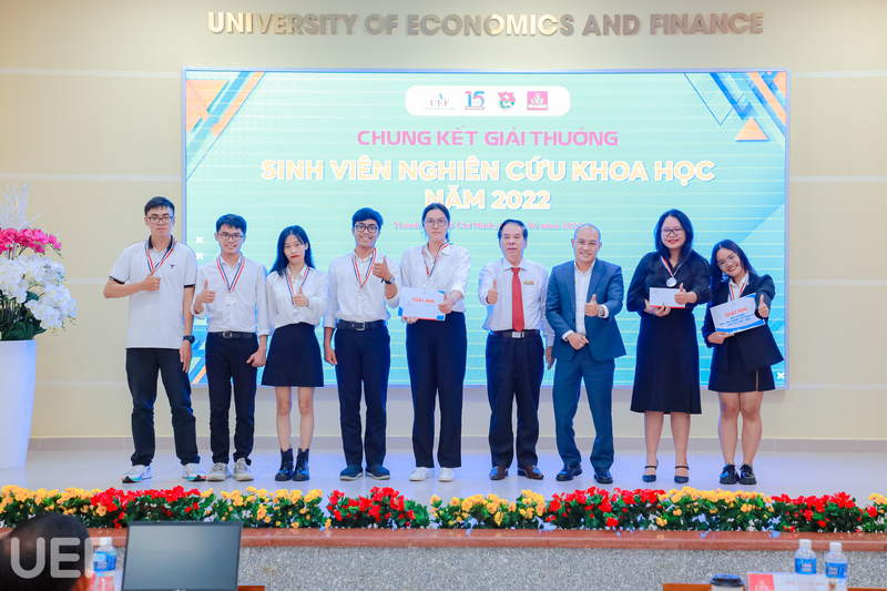 03 đề tài đạt giải Ba gồm: “A Comparison between the Efficacy of Quizlet and Anki in English Vocabulary Learning of Sophomores from the Faculty of English at the Ho Chi Minh City University of Economics and Finance" của nhóm sinh viên: Lê Quỳnh Thảo Quyên, Ngô Tường Quân; "Hành vi tiêu dùng của khách hàng đối với sản phẩm của doanh nghiệp sản xuất xanh tại Việt Nam" của nhóm sinh viên: Hoàng Nguyễn Phương Mai, Trần Nhật Băng, Nguyễn Thị Thùy Linh, Dư Khánh Ngọc, Giang Bảo Ngọc; “Ứng dụng Công nghệ số trong hoạt động tuyên truyền, phổ biến, giáo dục pháp luật cho sinh viên Trường Đại học Kinh tế - Tài Chính Thành phố Hồ Chí Minh (UEF)” của nhóm sinh viên: Chu Anh Tài, Nguyễn Quế Anh, Lê Trần Thủy Trang.