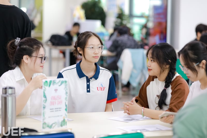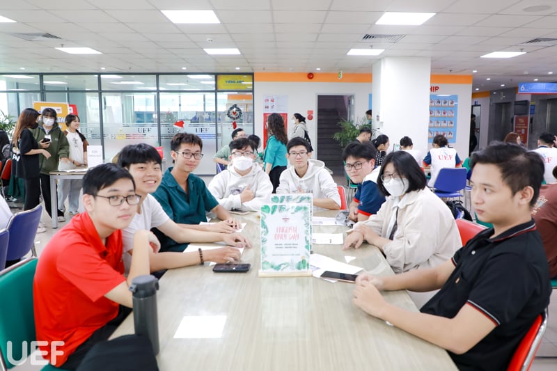 Với môi trường học tập quốc tế, chú trọng đào tạo tiếng Anh, Nhà UEF tạo nên không gian rèn luyện, trau dồi, cải thiện kiến thức ngoài giảng đường dành cho các bạn sinh viên có niềm đam mê với ngôn ngữ toàn cầu này. Đây chính là dịp để sinh viên UEF thuộc nhiều chuyên ngành có cơ hội gặp gỡ, giao lưu bằng tiếng Anh với nhau. Bên cạnh đó, các hoạt động như mini game, bài tập cũng được tổ chức để củng cố kiến thức và tăng khả năng phản xạ ngôn ngữ cho các bạn.