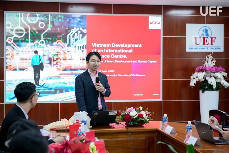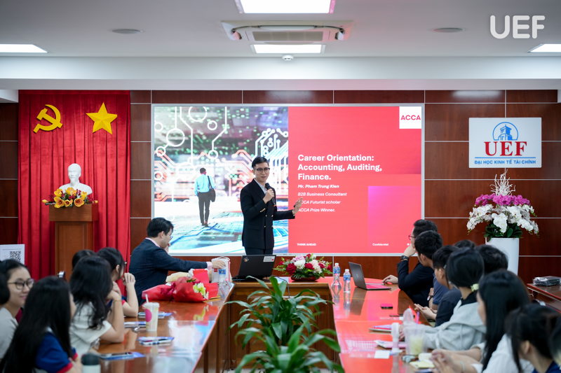 Anh đặc biệt nhấn mạnh tầm quan trọng của chứng chỉ ACCA đối với sinh viên theo đuổi nghề kế toán, kiểm toán hoặc tài chính doanh nghiệp, xem đây là “tấm hộ chiếu nghề nghiệp” giúp các bạn tự tin hơn khi bước vào thị trường lao động quốc tế. Diễn giả cũng chia sẻ những yêu cầu mới của ngành tài chính hiện đại, từ đó khuyến khích sinh viên rèn luyện tư duy phân tích, tác phong chuyên nghiệp và khả năng học hỏi liên tục.