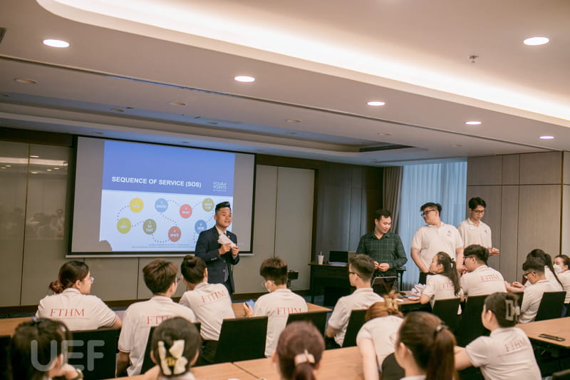 Trong chương trình kiến tập, sinh viên được các chuyên gia tại khách sạn Four Points Đà Nẵng chia sẻ lý thuyết và hướng dẫn thực hành về các bộ phận: FO (tiền sảnh), HK (buồng phòng), F&B (nhà hàng và quầy uống), Back Office (hậu sảnh).