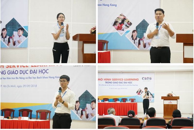 Sinh viên UEF trực tiếp tham gia vào các dự án Service Learning cũng đã có những chia sẻ đầy cảm xúc tại buổi hội thảo. Mặc dù mới thành lập nhưng trung tâm Service Learning UEF đã triển khai thành công được một số dự án tiêu biểu như: Link to the Future hướng nghiệp cho trẻ em làng SOS, hướng dẫn kỹ năng quản lý tài chính cho các em nhỏ ở trường tình thương Tân Sơn Nhì, Dự án những chiếc lọ thông minh và Sản xuất video hướng dẫn cách giao tiếp với người khiếm thị,…