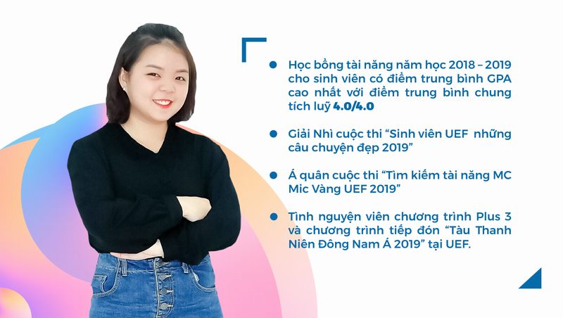 Với thành tích Giải ba môn Văn tại kỳ thi Học sinh giỏi Quốc gia, Minh Thư đã đạt mức học bổng tuyển sinh 100% tại UEF. Một trang mới trong thanh xuân của cô sinh viên truyền thông được mở ra cùng nhiều giải thưởng ấn tượng như: